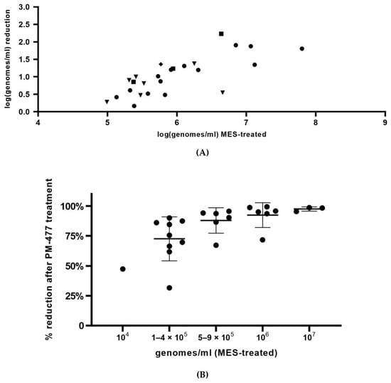 Most of the samples had an initial low load of living cells of Gardnerella (high Cq values, close to the limit of detection), making it difficult to document further reduction by PM-477 treatment. However, we could show that, the higher the initial value of log genomes/mL (low Cq values), the stronger the reduction by PM-477 treatment (Figure 4A, r = 0.9823). We determined the percentage reduction of Gardnerella species that was documented for each sample by means of viability-qPCR. Data are shown in Figure 4B, whereby samples have been categorized according to starting load of Gardnerella cells. We obtained reductions of more than 75% for most samples, with the strongest reductions, up to 98.7%, for the samples with the highest initial loads (log7 genomes/mL, as determined after MES treatment).
