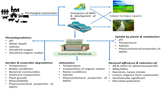 In addition to the ability to reduce the concentration of antibiotic drugs in wastewater systems, CWs have also been evaluated as a means to mitigate ARBs and ARGs. Figure 3 highlights, in brief, the protocols used for antibiotic resistance, factors associated to encourage this review study, along with the benefits and use of CWs. In this regard, the large body of work evaluating the efficacy of CWs to reduce fecal bacteria, including fecal pathogens, helps to inform our understanding of the potential of CWs for remediating antibiotic-resistant bacteria of both fecal and environmental origin. Previous studies have already reported the removal of pathogenic and fecal indicator bacteria in a variety of CW systems [192,193]. As with WWTP, positive correlations have been reported for CW between microbial parameters and NH4, total nitrogen (TN), and a negative correlative between E. coli and total suspended solids (TSS), TP, COD and biochemical oxygen demand (BOD) [194]. Lamori [195] highlights that the E. coli concentration decreased up to 50% in the effluent of a CW as compared to the influent. In the study, they compared the presence of E. coli, Enterococci, Bacteriodales (HF183) and ARG (erm(F) and int1) in the influent and the treated effluent. It was demonstrated that erm(F) and int were reduced by 13% and 67.2%. The study also found that there was no correlation between turbidity and ARG, though sediments act as a reservoir of ARGs. The growth of E. coli was affected by water temperature, sedimentation rate, pollution source and overall bacterial growth. At higher temperatures (especially during the summers), the reduction of E. coli (that was present in 100% of the water samples) ranged between 31 and 70% and Enterococci between 70 and 99%. The temperature had an impact on microbial composition in treatment plants that affected bacterial removal rates. It was indicated that the microbes grow and survive at a pH range of 5.5–7.5 and are pH-sensitive [196]. High pH was associated with increased bacterial/pathogen removal in CWs. The removal of pathogens also depends upon the physicochemical factors of wastewater [32] and the source of treated effluent. It is indicated that the overall bacteria decrease but are still abundant in the final effluent of a conventional treatment plant. CWs further reduce the concentration of bacteria due to vegetation, temperature, sunlight, high retention time, etc. Furthermore, as reported by [197], during winters, the removal rate of ARGs is considerably high as compared to summers, most probably due to low temperature.