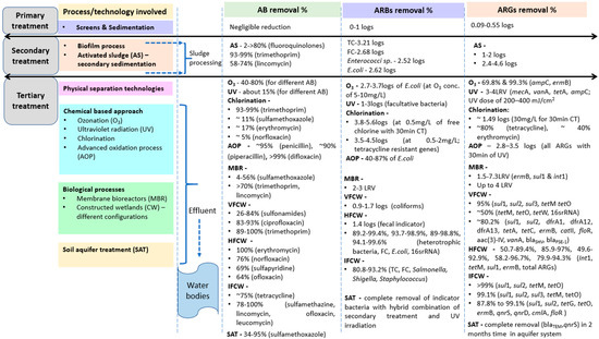 WWTPs are generally comprised of preliminary and primary treatment (screening and sedimentation basin) for the removal of suspended solids. The secondary treatment includes an activated sludge process and a biological contactor/filter process responsible for degrading/breaking organic compounds assisted by microbial metabolism. The tertiary treatment includes disinfection, CWs, sand filtration, a membrane bioreactor, etc. The treatment technology and use of tertiary treatment methods impact the prevalence of antibiotics, ARBs and ARGs.