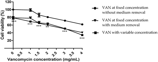 Cell viability of HUVECs after 24 h contact with vancomycin. Vancomycin (VAN) concentration ranged from 1 mg/mL to 4 mg/mL. ** p < 0.01, *** p < 0.001, for the comparison between VAN at a fixed concentration without medium removal and VAN with variable concentration. n = 3, error bars represent the standard error of the mean.
