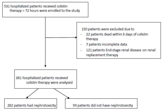 This retrospective study was conducted between December 2015 and June 2019 in Songklanagarind hospital, the largest university hospital in the South of Thailand. A total of 381 patients, identified through the hospital database, were enrolled in the study. Inclusion criteria were patients aged more than 18 years who received colistin intravenously for at least 72 h. In cases of multiple admissions with colistin administration, only the first admission episode was included in the analysis. Patients who were pregnant, had an end-stage renal disease, or received renal replacement therapy at the initiation of colistin administration, were dead within 3 days of colistin therapy, or had incomplete data were excluded. This study was approved by the institutional review boards of the Faculty of Medicine, Prince of Songkla University. (REC.62-173-14-3).
