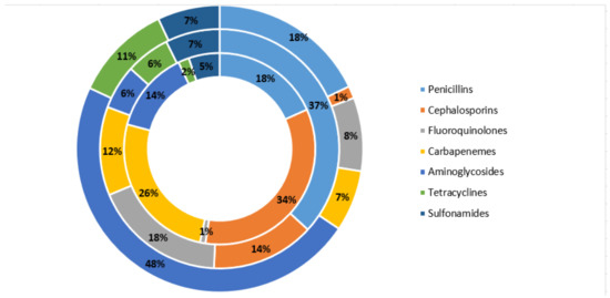 Referring to the antibiotic classes as reported in Figure 2, higher levels of resistance were observed for aminoglycosides (48%), penicillins (18%), and tetracycline (11%), while lower levels were found for fluoroquinolones (8%), carbapenems (7%), sulfonamides (7%) and cephalosporins (1%). The class with the greatest susceptibility is represented by cephalosporins (34%) followed by carbapenems (26%), penicillins (18%), aminoglycosides (14%), while lower percentages were found for sulfonamides (5%), tetracycline (2%) and fluoroquinolones (1%). The class with the highest frequency of intermediate was the one of penicillins (37%), followed by fluoroquinolones (18%), cephalosporins (14%), carbapenems (12%), sulfonamides (7%), tetracycline (6%) and aminoglycosides (6%).