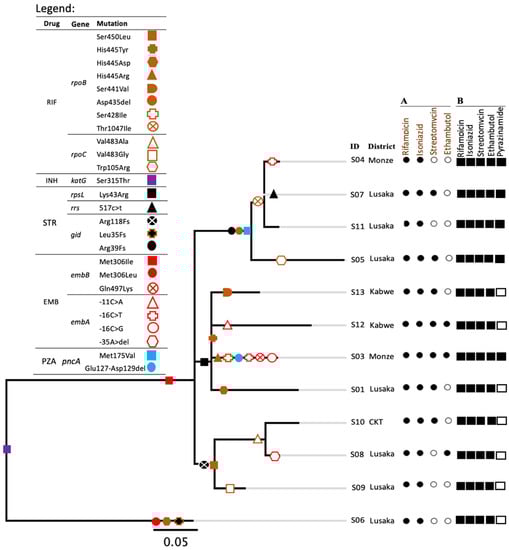 - Solo, E.S.; Suzuki, Y.; Kaile, T.; Bwalya, P.; Lungu, P.; Chizimu, J.Y.; Shah, Y.; Nakajima, C. Characterization of Mycobacterium tuberculosis genotypes and their correlation to multidrug resistance in Lusaka, Zambia. Int. J. Infect. Dis. 2021, 102, 489–496. [Google Scholar] [CrossRef] [PubMed]