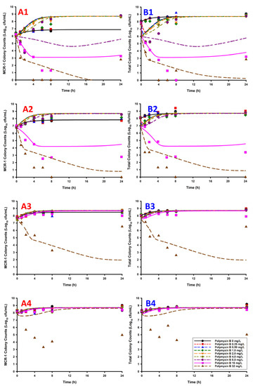 - Tsuji, B.T.; Landersdorfer, C.B.; Lenhard, J.R.; Cheah, S.E.; Thamlikitkul, V.; Rao, G.G.; Holden, P.N.; Forrest, A.; Bulitta, J.B.; Nation, R.L.; et al. Paradoxical Effect of Polymyxin B: High Drug Exposure Amplifies Resistance in Acinetobacter baumannii. Antimicrob. Agents Chemother. 2016, 60, 3913–3920. [Google Scholar] [CrossRef] [Green Version]