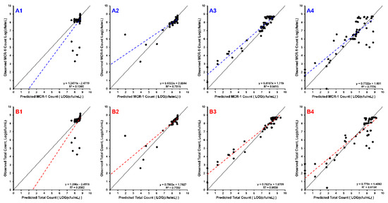 The line of identity (solid black) is overlain with the linear regression of the data (dashed line). Each row of sub-plots was divided so that B1–B4 are the observed vs. predicted plots for the total bacterial population (WT + mcr1a), and A1–A4 are the plots for mcr1a-only cells as determined by plating on kanamycin-containing plates. Each column of subplots represents the starting proportion of WT:mcr1a at the beginning of the experiment: 99% WT:1% mcr1a (A1,B1), 90% WT:10% mcr1a (A2,B2), 50% WT:50% mcr1a (A3,B3), and 10% WT:90% mcr1a (A4,B4).