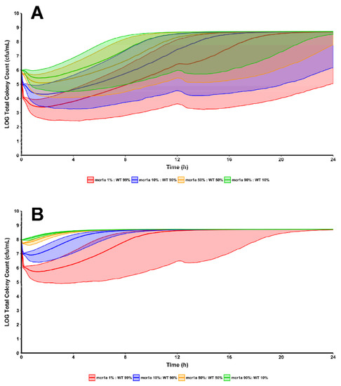 Using the same regimen structure implemented in the development of the mechanism-based model, simulations were conducted to see the effects of polymyxin B treatment against a bacterial population composed of varying proportions of WT and mcr1a cells. Simulations were conducted at both a 106 cfu/mL (A) and 108 cfu/mL (B) starting inoculum to explore the differences in regrowth pattern when there is an absolute increase in mcr-1-harboring cells, even if the proportion of cells remains constant.