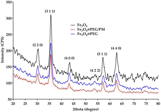 X-ray diffractogram of Fe3O4, Fe3O4@PEG, and Fe3O4@PEG/PM.
