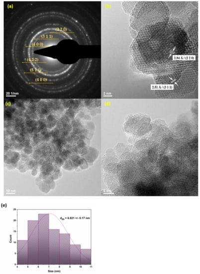 TEM and SAED analyses were used to retrieve information regarding the structure of MNPs. Through the acquired TEM images (Figure 2b–d), the morphology of the obtained nanoparticles and growth direction can be emphasized. From a structural point of view, the particles have a quasi-spherical shape, their agglomeration leading to cluster formation. At higher magnification (Figure 2b), it was established that the nanoparticles have dimensions of ~6.8 nm. The SAED diffraction pattern visible in Figure 2 highlights the complex nature of the ring, proving the crystallinity of the material. The formed planes, namely (111), (220), (311), (400), (422), (511), and (440), are in agreement with both literature [] and previously XRD-obtained data, confirming that PEG-functionalized magnetite is a polycrystalline material.