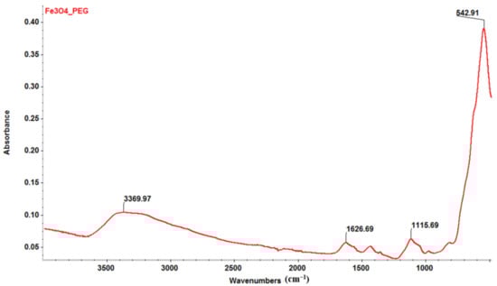 Experimental evidence supporting the formation of a thin PEG layer on the surface of MNPs can be seen in Figure 2d. Also, the FT-IR spectrum (Figure 3), highlights the presence of PEG. A first broad absorption band can be noticed between 3500 and 3000 cm−1, with a maximum of around 3369.97 cm−1 is assigned to the OH group characteristic to the PEG and PM. Between 1650 and 1600 cm−1, with the maximum around 1626.69 cm−1, the absorption band can be attributed to C=O characteristic to PM. At ~1115.60 cm−1, there can be noticed another absorption band corresponding to C-O vibrations characteristic to PEG. Also, the Fe-O absorption band was identified at 542 cm−1, characteristic of magnetite.