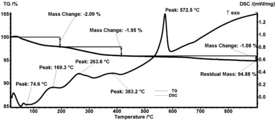 The thermal analysis for the Fe3O4@PEG nanoparticles (Figure 5) shows three distinct mass loss stages. The first one occurs in the interval RT-200 °C when 2.09% of the initial mass is lost. The process can be attributed to the water elimination from the sample, as an endothermic effect accompanies it. The exothermic effect from 169.3 °C can be attributed to the transformation of magnetite to maghemite (oxidation of Fe2+ to Fe3+) []. The second mass loss process, between 200–420 °C, accounts for 1.95% and is the main process of degrading the organic part by oxidation. Two exothermic effects, with peaks at 263.6 and 383.2 °C, accompany the oxidative degradation of PEG. The sample continues to slowly lose mass, 1.08%, up to 900 °C, while the residual mass is noted to be 94.88%. The exothermic peak registered at a temperature of 572.5 °C corresponds to the physical transformation of maghemite into hematite [].