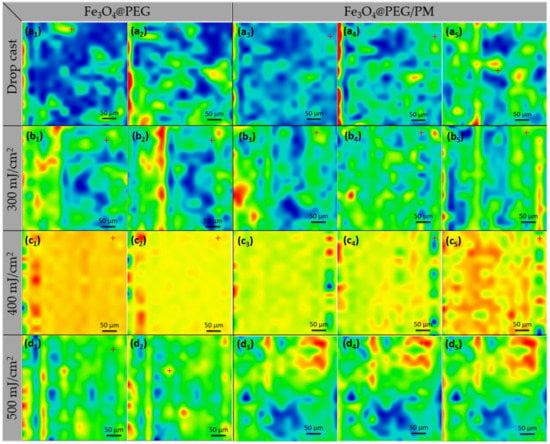 By analyzing the dropcast IR maps (Figure 6a), it can be seen that the samples are not uniformly deposited. Dropcast was used as a control to highlight the optimum laser fluence better. This was monitored by a color gradient of the composition with absorbance maximum (red) and minimum (blue) for several characteristic functional groups: C-H and C-O (characteristic for PEG) were monitored for Fe3O4@PEG and C-H, C-O (characteristic for PEG), and C=O (characteristic for PM) was monitored for Fe3O4@PEG/PM.