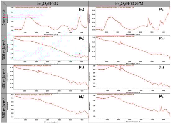 Supporting complementary information was obtained by analyzing IR spectra of Fe3O4@PEG and Fe3O4@PEG/PM dropcast and coatings produced at laser fluences of 300, 400, and 500 mJ/cm2 (Figure 7).