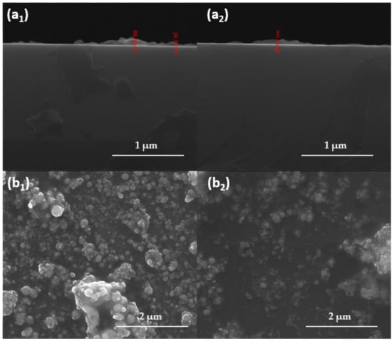 Coatings were further characterized by SEM. The micrographs are plotted in Figure 8 and offer information regarding the textured aspect of the coating formed at a laser fluence of 400 mJ/cm2 (Figure 8a), while the images from Figure 8b provide useful data concerning the thickness of the nanostructured coatings obtained at a laser fluence of 400 mJ/cm2. As it can be seen, the thickness of both coatings varies between 40 and 70 nm. The micrographs show a continuous material area with a wave-like cross-section aspect, which delineates the small agglomeration tendency.