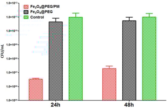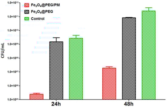 In the case of P. aeruginosa tests (Figure 10), the control CFU/mL values were similar for 24 and 48 h, namely ~1011 CFU/mL. These results demonstrate the high affinity of P. aeruginosa strains for colonizing the surfaces of medical devices, a reason for which this opportunistic pathogen is associated with numerous nosocomial, difficult-to-treat infections. Moreover, compared to the other analyzed microorganism, a lower inhibitory effect is noticed for both nanocomposites. Specifically, for Fe3O4@PEG, the CFU/mL values are reduced only by one fold, up to 1.7 × 1010 CFU/mL after 24 h, and 1.8 × 1010 CFU/mL after 48 h. However, for the Fe3O4@PEG/PM nanostructured coating, a more significant inhibitory effect is noticed; this material was able to reduce the colonization of P. aeruginosa up to five-folds, down to 1.5 × 106 CFU/mL for 24 h biofilms and 1.2 × 107CFU/mL after 48 h of incubation.