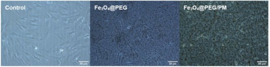 Morphology of MC3T3-E1 osteoblasts cultivated in the absence (control) and presence of Fe3O4@PEG and Fe3O4@PEG/PM samples.