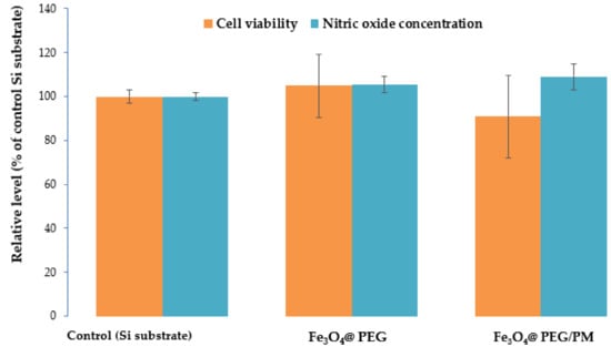 Cell viability and nitric oxide concentration after 24 h of incubation of MC3T3-E1 osteoblasts with Fe3O4@PEG and Fe3O4@PEG/PM samples. The measurements were performed in triplicate (n = 3) and the results were presented as average ± standard deviation relative to the control.