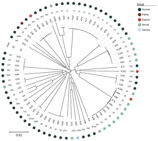 Among the 82 isolates identified as K. pneumoniae by matrix-assisted laser desorption/ionization time-of-flight mass spectrometry (MALDI-TOF MS), 72 were K. pneumoniae sensu stricto (50 human, 17 vervet, three equine, one canine and one feline), five Klebsiella quasipneumoniae subspecies quasipneumoniae (one human, two canine and two equine) and four Klebsiella variicola subspecies variicola (three vervet and one canine) based on Whole Genome Sequence (WGS) analysis. Multilocus sequence typing (MLST) of the 72 K. pneumoniae sensu stricto isolates led to identification of 35 STs, 27 of which were detected amongst human isolates. The two most prevalent lineages among human isolates were sequence type (ST) ST11 (10/50 human isolates) and ST39 (5/50) (Figure 1). Vervet isolates displayed a limited number of STs with ST60 (9/17) and ST23 (5/17) dominating (Figure 1). STs for the remaining K. pneumoniae isolates are displayed in Figure 1. MLST analysis of the five K. variicola subspecies variicola isolates showed that they were all different STs: ST697, ST1708-DLV (double locus variant), ST1791-SLV (single locus variant), ST209-SLV and ST549-SLV. Similarly, all five K. quasipneumoniae subspecies’ quasipneumoniae isolates belonged to distinct STs: ST1539, ST2638, ST1077-DLV, ST2637-SLV and ST338-SLV.