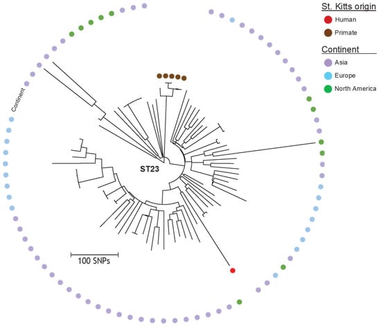 In this study, we characterized the genomes of clinical K. pneumoniae isolates obtained at the diagnostic laboratories of a hospital and a veterinary school on the small Caribbean island of St. Kitts. The objective was to assess the risk of zoonotic transmission within this confined geographical area. The island is an ideal place to perform this type of study since it is a small island of about 174 km2 with an estimated population of approximately 57,000 people, and an even larger population of African green monkeys or vervets (Chlorocebus sabaeus) that were introduced during the 17th century on ships running the slave trade from Africa. Based on available data from the main hospital in the Federation of St. Kitts and Nevis, which deals with most of the patients in the country, the incidence of Klebsiella infections in humans is about 80 infections annually. Nevertheless, UTIs may also be treated by primary practitioners and, as such, the data may be an underestimation. Our study was conceived after two previous studies showed that vervets on the island suffer fatal infections caused by hypermucoid K. pneumoniae [] and are a reservoir of this pathogen, with carriage rates of approximately 40% and 20% in captive and wild-caught individuals, respectively []. The true level of infections in vervets cannot be estimated as most animals are living in the wild and no data are available. Available local isolates obtained from companion animals (dog, cat, and horse) were included in the study to study whether there could be another potential source of K. pneumoniae infections on the island, as these animals are in contact with both vervets and humans as well as each other.