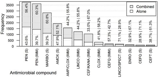 The number (height of bars) and percentage (numerical values) of antimicrobial compounds used as the only treatment per treatment course or used in combination with other compounds within the same treatment course. Systemic procaine benzylpenicillin (PEN_S); intramammary procaine benzylpenicillin (PEN_IMM); systemic marbofloxacin (MARBO_S); systemic amoxicillin (AMOX_S); intramammary ampicillin + cloxacillin (AMP/CLOX_IMM); intramammary lincomycin (LINCO_IMM); intramammary cefalexin + kanamycin (CEF/KANA_IMM); intramammary cloxacillin (CLOX_IMM); intramammary cefquinome (CEFQ_IMM); systemic lincomycin + spectinomycin (LINCO/SPECT_S); systemic enrofloxacin(ENRO_S); systemic cefquinome (CEFT_S CEFQ_S); systemic ceftiofur (CEFT_S).