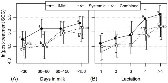 Model-based means of logarithm-transformed somatic cell count (SCC) at the closest post-treatment test milking depending on the penicillin treatment scheme (intramammary (IMM)/systemic/combined penicillin) and (A) lactation stage at treatment or (B) lactation number at treatment. Error lines denote the 95% confidence intervals and means without common letter at the same days in milk or lactation are statistically significantly different (p < 0.05).