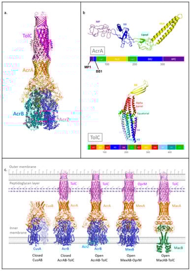 - Tikhonova, E.B.; Zgurskaya, H.I. AcrA, AcrB, and TolC of Escherichia Coli Form a Stable Intermembrane Multidrug Efflux Complex. J. Biol. Chem. 2004, 279, 32116–32124. [Google Scholar] [CrossRef] [PubMed]