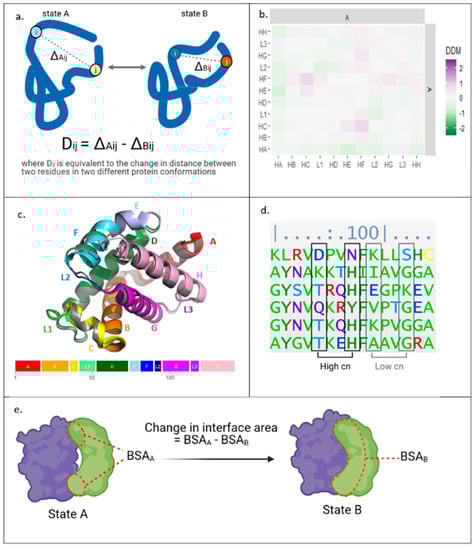 Evaluating the communication of conformational changes in a complex multi-component system such as a tripartite assembly requires comparison of the different conformational states that is independent of reference-frame, and one approach suitable to this requirement is application of the difference distance matrix (DDM) []. DDM algorithms compute changes in distances between all residue pairs in two different protein states (Figure 2a). As an example, a block DDM analysis comparing the average movement of helices between deoxy- and oxy-states of the α-subunit of hemoglobin A is shown in Figure 2b. The plot clearly shows the movement of the F-helix, particularly in relation to the C-helix, which is known to be important for the protein’s mechanism of action []; whilst, the same motion is less discernible in the aligned structure models (Figure 2c).
