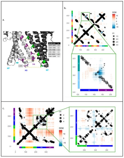 The DDM for TolC (Figure 3b) showed that, as previously reported [], there was little TolC intrasubunit movement, with changes in the distance between residue pairs often being less than 2 Å. As expected, many of the strong ECs correlated to physically close residues, visible as lines of coupled residue pairs along the diagonal and as regions of strong ECs that correlate with the alpha barrel and equatorial domains of TolC (Figure 1b and Figure 3b). These did not show large movements in the DDM analysis. However, there was one region where the ECs and DDM appeared correlated: between residues 126–206 and 348–427, where the periplasmic helices of TolC moved closer to each other within a protomer. On closer inspection, these helix movements were slightly more complex, with simultaneous contraction and expansion (inset of Figure 3b). The largest region of contraction was between the H3-H4 loop and the H7-H8 loop; strong ECs were observed in this area, suggesting this movement might be conserved (Figure 3b, inset). Outward movement of helix H3 away from the loop of H7-H8 was also observed, but it did not correlate with any strong ECs (Figure 3b, inset).