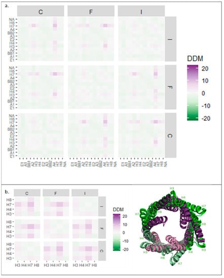 The block analysis for all the TolC domains of all three protomers (Figure 4a) showed symmetrical conformational changes on pump activation. Quaternary changes were more pronounced than those at the tertiary level (stronger colouring on the squares off the diagonal) and an overall slight contraction of the trimer was observed (pale green colouring in the distribution) (Figure 4a). However, this contraction was relatively minor, illustrating that TolC was generally static, apart from the periplasmic helices, which moved outwards at the quaternary level (Figure 4b). Helix H7 moved the most—by more than 10 Å away from its neighbouring protomer’s equivalent helix (Figure 4b, right). As shown in Figure 3a, H7 formed an interface with H4 of the neighbouring subunit, so the movement of H7 is likely important for trimer assembly.