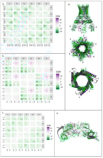 As in the case of TolC, AcrA protomers assemble into a multimeric state in the pump, meriting an analysis of movement in the quaternary structure. A block DDM analysis of the AcrA hexameric ring showed symmetrical changes (Figure 5a,d), including larger changes at the quaternary level than the tertiary. Conformational compaction of the ring (pale green colouring in the distribution) was also observed throughout the plot.