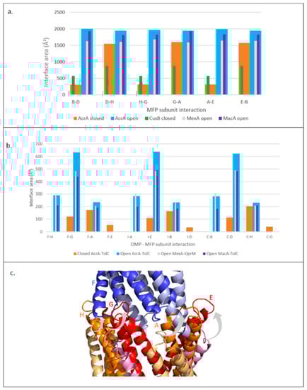 Interface surface areas were calculated using ‘Protein interfaces, surfaces and assemblies’ (PISA) service at the European Bioinformatics Institute, (http://www.ebi.ac.uk/pdbe/prot_int/pistart.html, accessed on 1 April 2021) [], which measures the difference in total accessible surface areas of isolated and interfacing structures. To measure interface area changes of isolated domains, we generated structure models using Coot or PyMOL that encompass the contacting domains. The following PDB files were used: 5V5S and 5NG5 for the open (transport) and closed (resting) states of AcrAB-TolC, 3NE5 for the closed state of CusAB, 5NIK for the open state of MacAB-TolC, and 6TA6, 6IOK, 6IOL for the open state of MexAB-OprM.