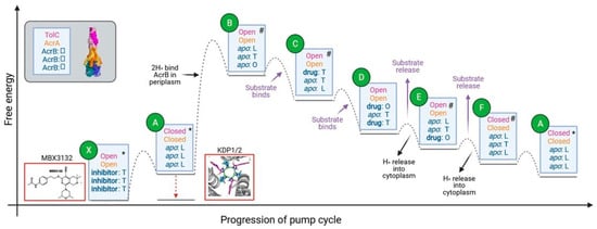 Proposed energy transitions during the AcrAB-TolC pump cycle. Qualitative energy diagram with relative energy levels of predicted states in the pump cycle. Text in blue boxes describes the conformations and the ligand binding states of TolC, AcrA, and the three AcrB subunits from top to bottom. Boxes outlined in red show pump inhibitors. * indicates states where high-resolution structures of the whole pump assembly exist. # indicates where high-resolution structures of AcrB in the specified conformation exist. The dotted lines indicate energy barriers to transition between the connected species, with maxima indicating transition states. AcrB subunit conformations are L = Loose, T = Tight, O = Open.