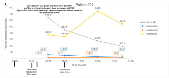In our pilot study on four patients, we did not encounter any complex issues on assay interference. Furthermore, the multiple antibiotics identified in each patient’s plasma samples correlated to the antibiotic combination dosing regimens observed clinically. Thus, even though antibiotic pharmacokinetics is not the main focus of the pilot study, the fluctuating antibiotic concentrations observed in our case series of four patients were consistent with the expected individual pharmacokinetic profiles. In Patients 001 and 004 with normal renal function, we observed a consistent decrease in fosfomycin, piperacillin-tazobactam, meropenem, and levofloxacin post-administration; and detected a steady increase in fosfomycin concentrations upon redosing in Patient 001. In Patient 002 and 003 with impaired renal function, we observed a substantial decrease in all antibiotic concentrations measured post intermittent hemodialysis. These observations suggested that our method is likely to be highly robust and have minimal assay interference from endogenous compounds. This key feature will be essential when measuring antibiotic levels in critically-ill patients who are often on multiple drugs.