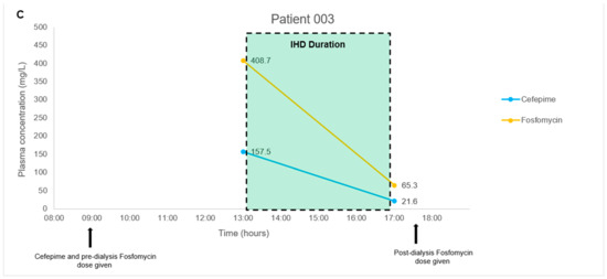 (A–D). Plasma concentration-time courses of fosfomycin and the respective combination antibiotics in the four patients. Black arrows depict antibiotic administration. Dialysis treatment duration is depicted by box size. IHD, intermittent hemodialysis.