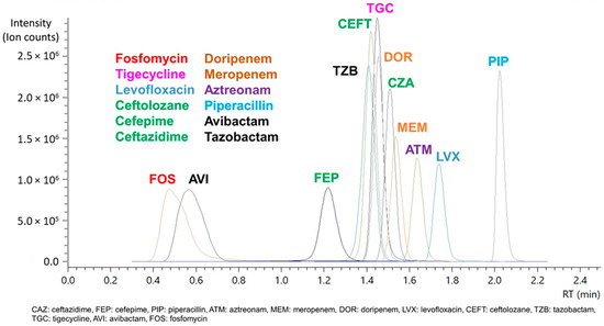 Chromatogram of each antibiotic compound and β-lactamase inhibitor (depicted in black) using a 2.1 × 50 mm C8 column.