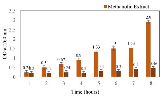 The overnight culture of the S. aureus was centrifuged at 10,000 rpm for 15 min. The cell pellets were collected and washed twice with a normal saline solution. It was then re-suspended in the saline solution, and the final cell density was adjusted to 1.5 × 108 CFU/mL at 600 nm by 0.5 McFarland’s turbidity method. The extract was added at a final concentration equivalent to the Minimum Inhibitory Concentration (MIC) to the suspension and was incubated in a shaker incubator at 37 °C for 24 h. The cell suspension without the plant extract was used as a control. At every 2 h, a 1 mL sample was withdrawn and centrifuged at 10,000 rpm for 10 min. Then the supernatant was collected, and the absorbance at 260 nm was measured against the saline solution as blank [31].