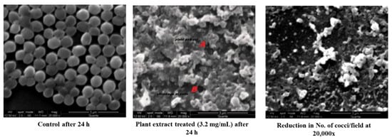 A remarkable morphological difference was observed in the plant extract (MIC of 3.2 mg/mL) treated Staphylococci than that of the control (Figure 2). An SE micrograph of the untreated control clearly shows the spherical structure of cocci, whereas significant cell shrinking and distorted cell structures can be observed in the plant extract-treated cells. It was also observed that the number of cocci per field was profoundly reduced when compared with the control, which indicated the cell death and the cellular debris of the disrupted cell could also be visualized. The extract would have solubilized the lipid contents of the cell wall and extensively damaged the cellular matrix resulting in leakage of intracellular components with a massive shrinkage of cells. A significant structural loss was almost seen in the cocci treated with plant extract. Thus, the severity of the methanolic extract of S. glauca DC., against S. aureus has been proven by SEM analysis. Similarly, aqueous extracts of Rhazya stricta were treated against S. aureus, and prominent cell leakage was observed at each stage where the cell lost its shape with maximum leakage of the cytoplasmic materials [17].