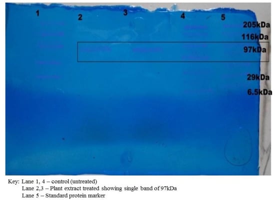The dialyzed cell protein sample was subjected to SDS-PAGE. It was observed that the protein sample treated with the plant extract varied from the control (untreated). One band of 97 kDa of molecular weight was observed in the treated protein sample, which showed that the plant extract had lysed and disrupted the cell protein of the S. aureus (Figure 4). It had earlier been reported that polypeptide profiles of the multiple drug-resistant clinical strain S. aureus, when exposed to the extracts of the leaf of Pisidium guajava, exhibited a strong proteolytic activity with a band of 29 kDa [19].