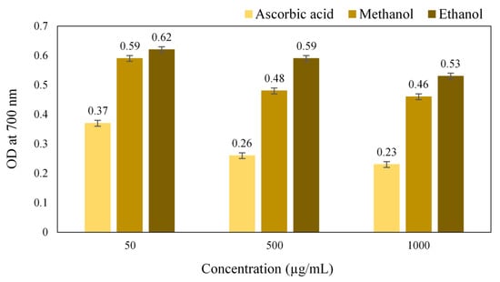 A gradual increase in the reducing power with an increase in the concentration of the extract was obtained, which was due to the presence of plant chemicals that reduces the Ferric (Fe3+) ions to Ferrous (Fe2+) ions. The results of ferric reducing activity (Figure 6) showed that the methanol extract has higher antioxidant potential compared to the ethanol extract. The reducing power is an indication of the presence of a reducing agent having the availability of atoms that can donate electrons to react with free radicals and then convert them into more stable metabolites and terminate the radical chain reaction [24]. Thus, it revealed that the crude extract of S. glauca had the reducing agents that can scavenge the free radicals.