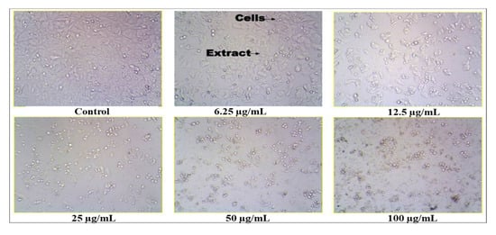 The extract that exhibited higher antioxidant activity was further analyzed for its cytotoxic or anticancer activity. The human breast cancer cell lines (MCF 7) were obtained from the National Centre for Cell Science (NCCS), Pune, India. The cells were subcultured in eagle’s minimum essential medium supplemented with 10% fetal bovine serum (FBS). The cells were maintained at 37 °C, 5% CO2, 95% O2 and 100% relative humidity. The monolayer cells are separated with trypsin- ethylenediaminetetraacetic acid (EDTA) to make single-cell suspensions. The cell viability was tested by trypan blue exclusion method using a haemocytometer. A known number of cells 1 × 105 cells/well in 100 µL medium were seeded into 96 well plates, respectively, for performing the MTT assay. The samples were initially dissolved in dimethylsulfoxide (DMSO). The cells were treated with different concentrations of the plant extract such as 6.25 µg/mL, 12.5 µg/mL, 25 µg/mL, 50 µg/mL and 100 µg/mL, respectively, and incubated for 48 h at 37 °C with 5% CO2, 95% O2 and 100% relative humidity. After 48 h of incubation, approximately 15 µL of MTT (3-[4,5-dimethylthiazol-2-yl]2,5-diphenyltetrazolium bromide) was added to each well and incubated at 37 °C for 4 h. After incubation, the mixture was solubilized in 100 µL of DMSO. The absorbance of suspension was recorded at 570 nm using a microplate reader. The percentage (%) cell inhibition was calculated by using the following formula,