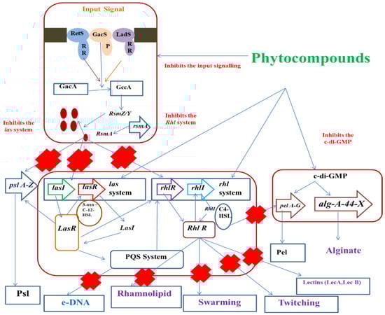 Diterpene phytol reduced twitching and motility of flagella and biofilm formation in P. aeruginosa, strain PAO1. It elicited a strong inhibitory effect against the production of pyocyanin in P. aeruginosa []. An important antimicrobial agent called carvacrol isolated from oregano oil stopped the formation of biofilm in S. aureus, strain 0074. Moreover, it was also found to reduce civil (gene encoding the N-acyl-l-homoserine lactone synthase) production of violacein and activity chitinase regulated by QS [].