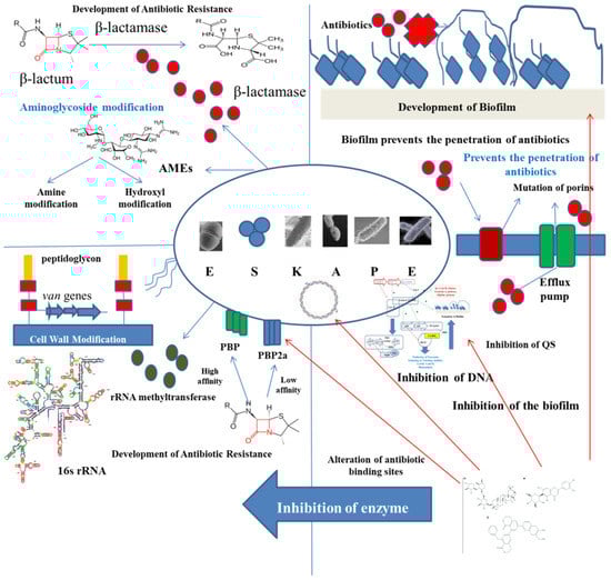 Antimicrobial resistance (AMR) is a global threat to public health. This AMR is acquired by bacteria through horizontal gene transfer (HGT) via chromosomes, genetic mutations, transposons, plasmids, and some other mobile genetic elements [,]. The first-rate class of opportunistic pathogens that are considered as a universal threat to mankind are known as ESKAPE, that includes Enterococcus faecium, Staphylococcus aureus, Klebsiella pneumonia, Acinetobacter baumannii, Pseudomonas aeruginosa, and Enterobacter sp. Thus, it can be said that AMR can be found in both Gram-negative and Gram-positive bacterial strains. The rate at which AMR is being developed in these pathogens is alarmingly increasing. A. baumannii, K. pneumonia, and P. aeruginosa are resistant to carbapenem, and members of Enterobacteriaceae and S. aureus are partially resistant to vancomycin and fully resistant to methicillin and thus they are called methicillin resistant S. aureus (MRSA). All these resistant bacterial classes are also known as superbugs. Such pathogens are known to cause lethal diseases among immunocompromised and severely ill individuals because of improper treatment []. Hence, the effects of ESKAPE are devastating.