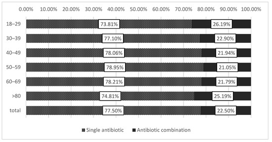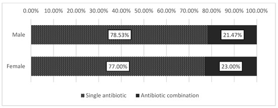 Based on the number of patients, the overall prevalence of antibiotic combination therapy was 22.49%. The dispensing of an antibiotic combination was most common in the youngest (18–30 years, 26.19%) and the oldest age groups (>70 years, 25.19%), p < 0.001 (Figure 1). As shown in Figure 2, a larger share of female patients were dispensed antibiotic combinations compared to men (23.00% vs. 21.47%, p < 0.001). Additionally, the sex-standardized rates of dispensed antibiotic combinations, expressed in packages of antibiotics per 1000 persons per year, were 119.56 in female vs. 92.73 in male beneficiaries.