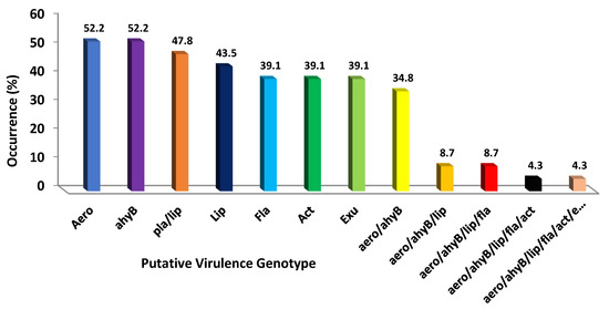 - Ramadan, H.; Ibrahim, N.; Samir, M.; Abd El-Moaty, A.; Gad, T. Aeromonas Hydrophila from Marketed Mullet (Mugil Cephalus) in Egypt: PCR Characterization of β -Lactam Resistance and Virulence Genes. J. Appl. Microbiol. 2018, 124, 1629–1637. [Google Scholar] [CrossRef] [PubMed]