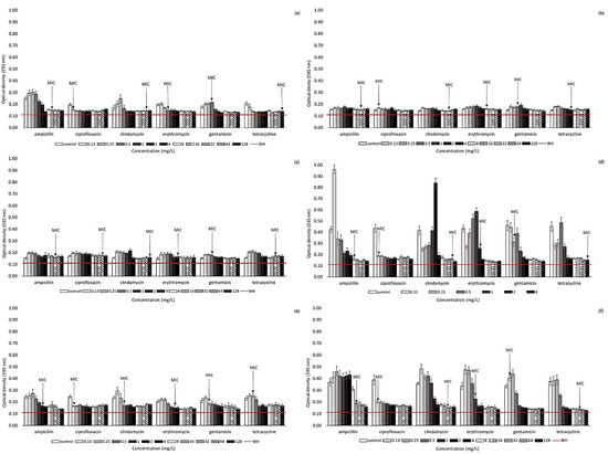 Biofilm formation in the presence of antibiotics. (a) Aliarcobacter butzleri CCUG 30484; (b) Aliarcobacter butzleri UPa 2013/6 (isolated from food); (c) Aliarcobacter butzleri UPa 2013/9 (isolated from wastewater sample); (d) Aliarcobacter butzleri UPa 2013/30 (isolated from food); (e) Aliarcobacter butzleri UPa 2015/13 (isolated from food); (f) Aliarcobacter butzleri UPa 2015/14 (isolated from food). The horizontal line represents the influence of BHI broth (values under horizontal line—biofilm-negative; values above line—biofilm-positive).