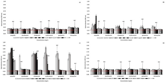 Biofilm formation in the presence of antibiotics. (a) Aliarcobacter cryaerophilus CCM 7050; (b) Aliarcobacter cryaerophilus UPa 2013/13 (isolated from water); (c) Pseudarcobacter defluvii LMG 25694; (d) Aliarcobacter skirrowii LMG 6621. The horizontal line represents the influence of BHI broth (values under horizontal line—biofilm-negative; values above line—biofilm-positive).