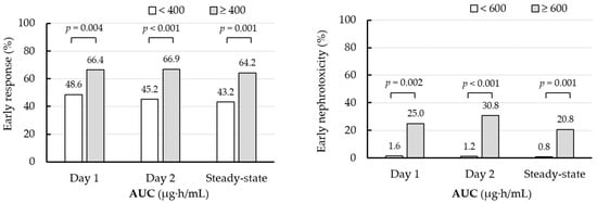 AUC on day 2 (µg·h/mL) | <400 | 19/51 (37.3%) | reference | 37/73 (50.7%) | reference |