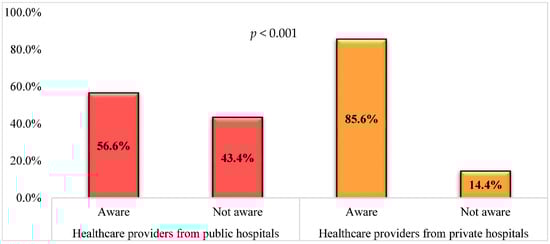 Healthcare providers were asked about their awareness of the presence of the NAP on AMS (2018–2022) in Jordan, where 75.8% of them (n = 119) reported being aware of the NAP, while the remaining 24.2% (n = 38) were not aware of the NAP. Healthcare providers working at the private hospitals were more aware of existing NAP at their institution compared to those working in public hospitals, as seen in Figure 1 (85.6% versus 56.6%, p < 0.001).