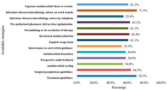 Figure 2 illustrates the available AMS strategies at the hospitals as reported by healthcare providers. Results showed that the most available strategies were: infectious disease/microbiology advice of ward round (n = 112, 71.3%), treatment guidelines (n = 111, 70.7%), surgical prophylaxis guidelines (n = 101, 64.3%), and pre-authorized pharmacy-driven dose optimization (n = 99, 63.1%). For more details about the available strategies, refer to Figure 2.