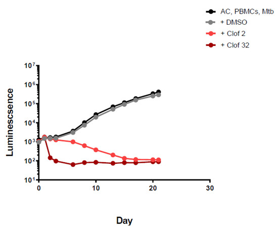 Supporting information as described can be downloaded at: https://www.mdpi.com/article/10.3390/antibiotics11101274/s1. Figure S1: Luminescence detection at different time points for clofazimine in TB-infected PMBCs obtained from donor 2. Figure S2: Luminescence detection at different time points for nitazoxanide in TB-infected PMBCs obtained from donor 2. Figure S3: Luminescence detection at different time points for meropenem in TB-infected PMBCs obtained from donor 2. Figure S4: Luminescence detection at different time points for faropenem in TB-infected PMBCs obtained from donor 2. Figure S5: Luminescence detection at different time points for tebipenem in TB-infected PMBCs obtained from donor 2.