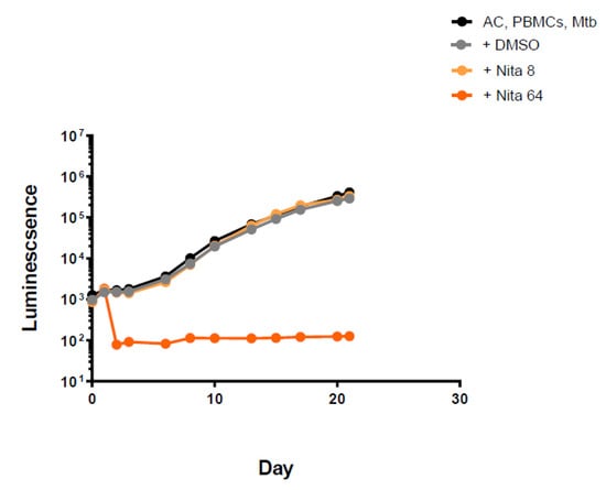 Luminescence detection at different time points for nitazoxanide in TB-infected PMBCs obtained from donor 1. AC: alginate collagen; PMBCs: peripheral blood mononuclear cells; Mtb: Mycobacterium tuberculosis; DMSO: dimethyl sulfoxide; Nita8: Nitazoxanide 8 mg/L; Nita 64: Nitazoxanide 64 mg/L.
